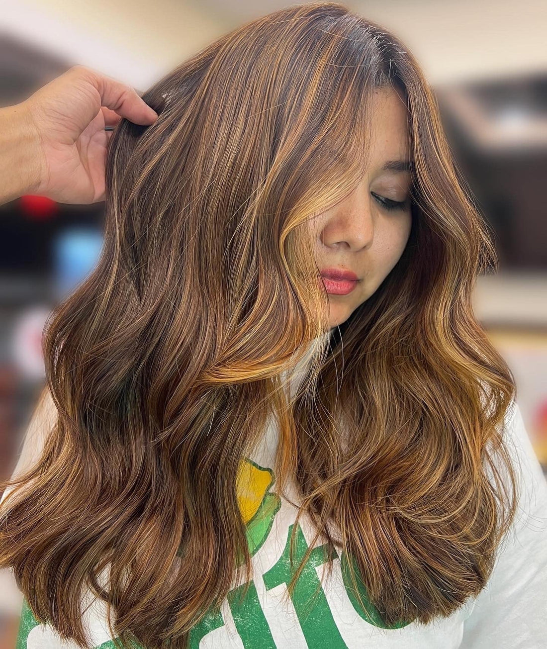 Subtle layers around the front define the face, while the rest of the hair flows freely in soft waves. The golden brown color is blended with lighter, honeyed tones around the front, creating brightness and contour. A natural, easygoing finish that flatters.