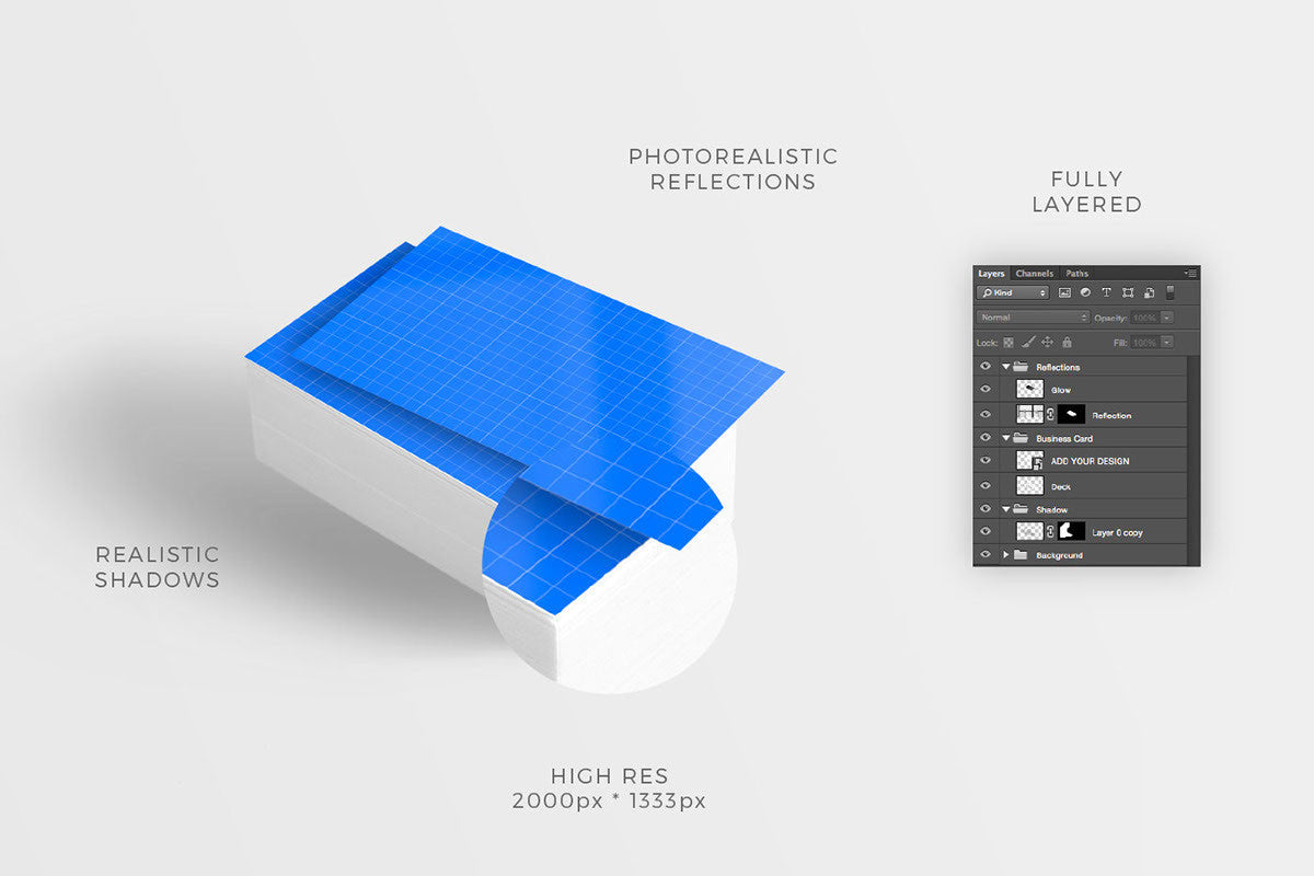 We have created these mockups by photographing real white business cards in a light tent. Most of the shadows are extracted from real hi-res photos to bring that smooth real shadow. We’ve also added a realistic reflections to make it look like it would reflect a real window. Just change them how you want. We’ve made this with Photoshop CC so you’ll be in the safe side if you’ve got it too. We hope this makes your day! If you need more of this quality business card mockups, check out the higher quality premium product: 32 Clean Business Card Mockups.
